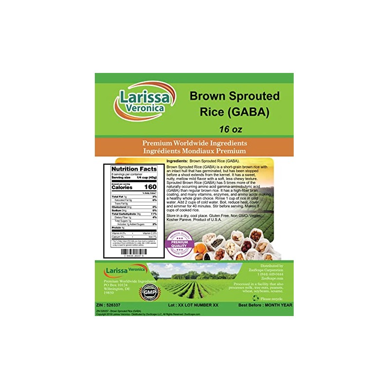 Brown Sprouted Rice (GABA) is a short-grain brown rice with an intact hull that has germinated, but has been stopped before a shoot extends from the kernel. It has a sweet, nutty, mellow mild flavor with a soft, less chewy texture. Sprouted Brown Rice (GABA) has 5 times more of the naturally occurring amino acid gamma-aminobutyric acid (GABA) than regular brown rice. It has a high-fiber bran coating, and many vitamins, enzymes, and amino acids making a healthy whole grain choice. - Rinse 1 cup of rice in cold water. Add 2 cups of cold water. Boil, reduce heat, cover and simmer for 40 minutes. Stir before serving. Makes 3 cups of cooked rice. - Larissa Veronica is an exclusive line of natural premium-quality products that use only the purest and finest ingredients from around the world. Larissa Veronica is hallmarked by the highest possible standards of purity, stability and freshness. All of our products are prepared with the highest elements of quality control, from raw materials through the entire manufacturing process, up to and including the moment that the bottles or bags are sealed for freshness and shipped out to you. Our highest possible standards are certified by independent laboratories and backed by our personal guarantee. - Larissa Veronica strives to make all products affordable and we are constantly researching the market to maintain our affordability and to look for new ways to serve you and the ones you love. Larissa Veronica has become a trusted household name for many families. - Larissa Veronica is packed in tamper-proof, food-grade, recyclable containers. - ZooScape is proud to be the exclusive distributor of all Larissa Veronica spices, snacks, foods and ingredients in the United States, Canada and around the world. - Store in a dry, cool place. Glu