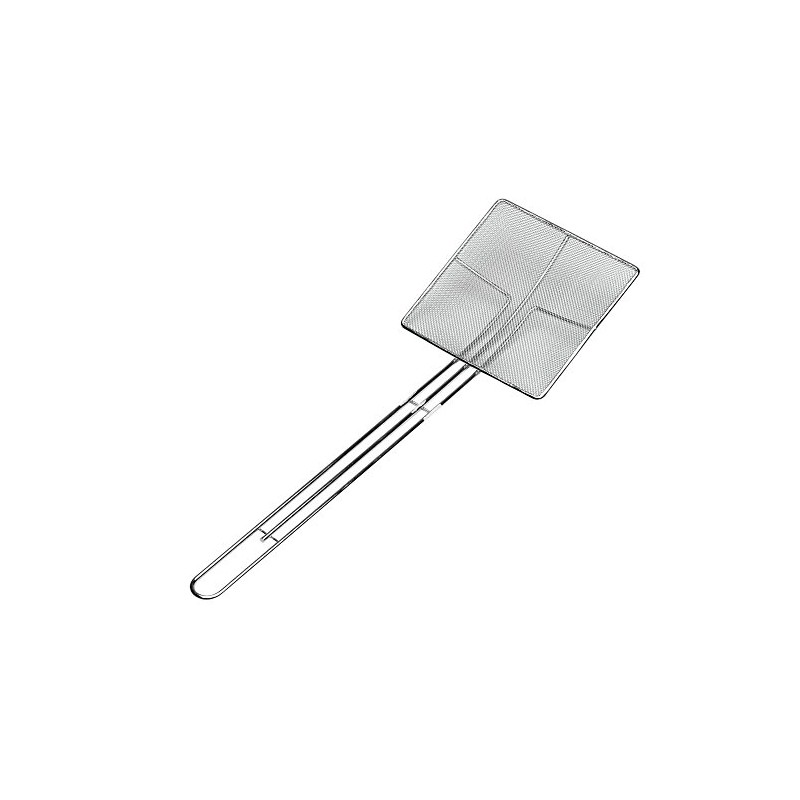 Mid-sized, fine-mesh square skimmer has a one-piece handle that transfers less heat from hot cooking oil to bare hands.