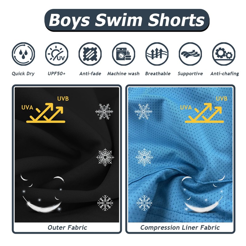 • Soft Boxer Brief Compression Liner: Boys swim trunks liner is made of four-way stretch fabric, which provides sufficient compression support to reduce muscle fatigue and will not cause a sense of restraint. The compression liner features boxer brief design, seamless cut to fit the body curve, ensuring that it moves with the body without curling or binding. Soft and icy fabric, 600+ microporous breathable, combined with quick-drying fiber technology, keeps dry and comfortable, 0 friction