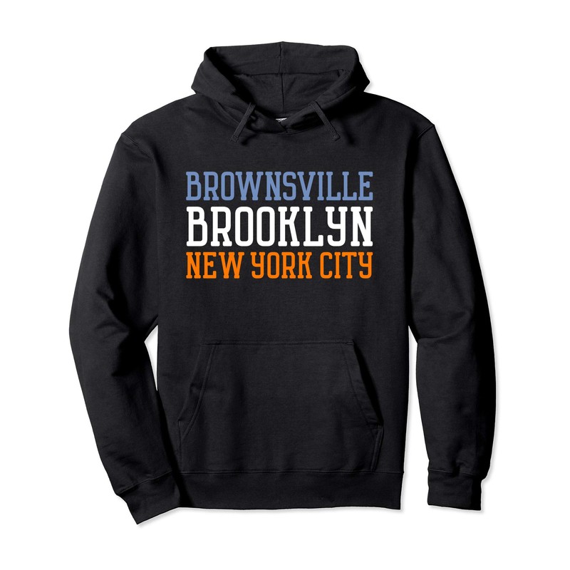 - Brownsville neighborhood Brooklyn NY hoody. Classic text in New York City colors of blue white and orange. This pullover hoody is perfect for a gift or souvenir for those who love the big apple NYC and the Brooklyn borough