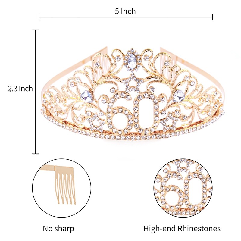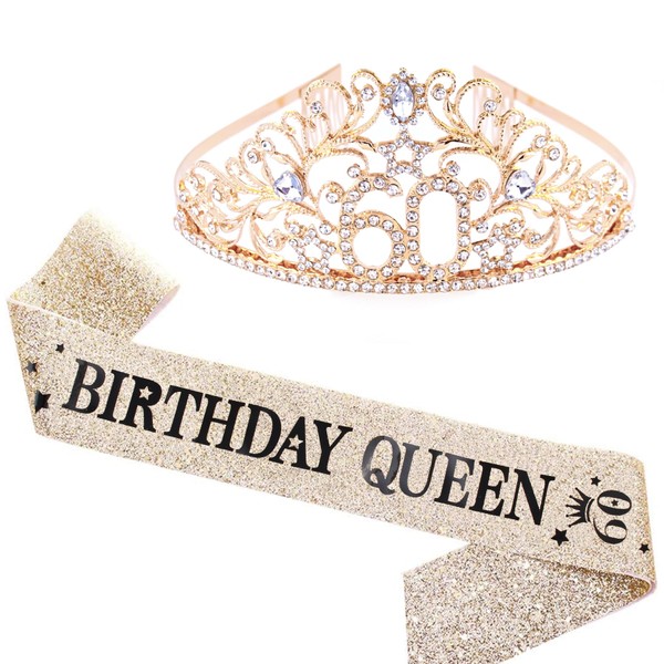 BRT Bearingshui 60th Birthday Sash and Tiara for Woman, Gold Birthday Sash Crown 60 Birthday Queen Sash for Woman, 60th Birthday Gifts for Happy 60th Birthday Party Favor Supplies
