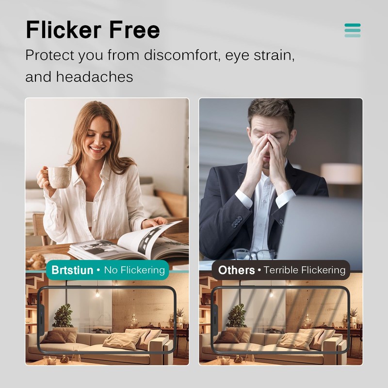 - 【No Flickering】 Upgraded quality materials produce flicker-free LED bulbs without discomfort, eye stain or headaches. Suitable to be used any room like bathroom, living room, bedroom, kitchen, office and garage