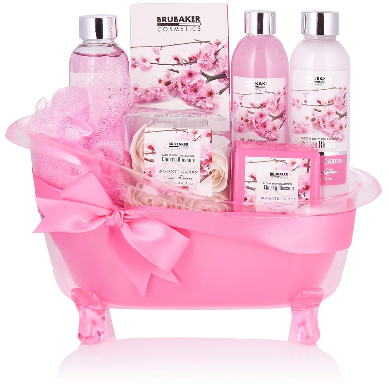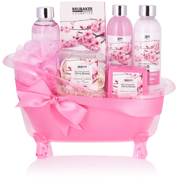 Brubaker Cosmetics Bath and Shower Set Cherry Blossom - 8-Piece Gift Set in Decorative Tub