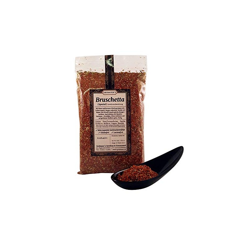 Roast the bread and cover with good pure olive oil with diced tomatoes. Finally, sprinkle a good pinch of the bruschetta spice preparation on it, done.