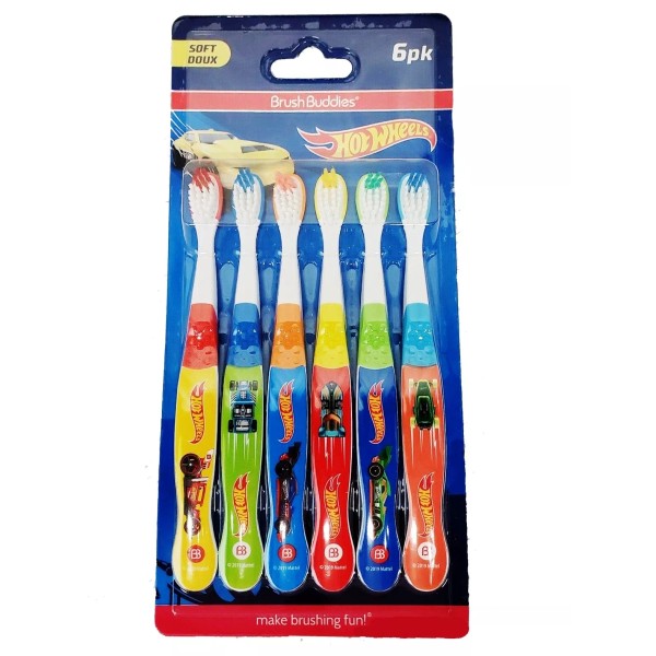 • Brush Buddies Hot Wheels Toothbrush 6 Pack comes with Red, Yellow, Orange, Blue, Green and Sky Blue toothbrushes. The rounded bristles are soft which protect the enamel of children's teeth and protect delicate gums.