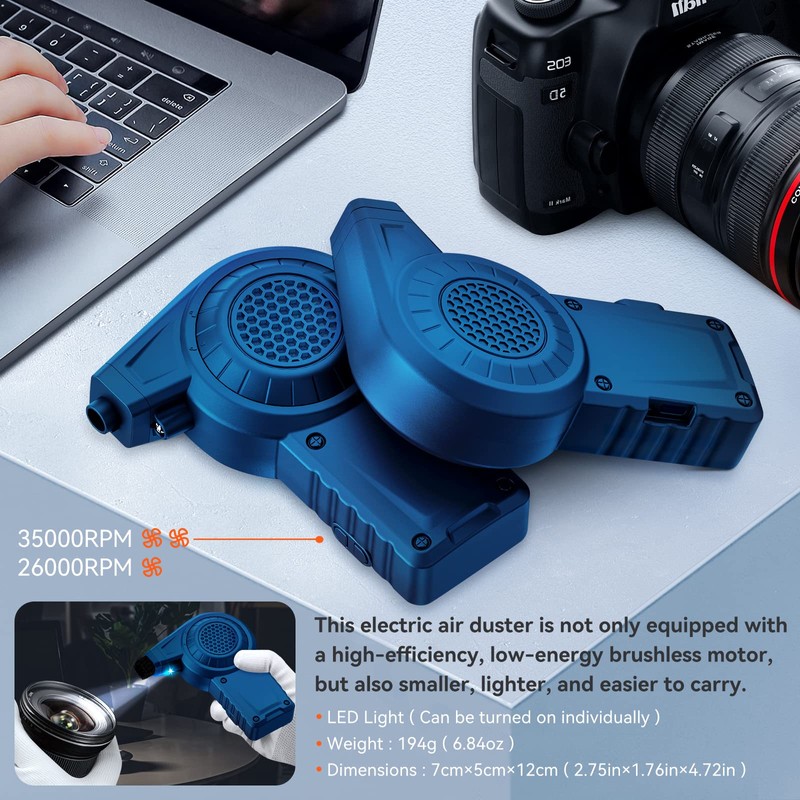 Brushless motor mini 35000 rpm: Reesibi electric dust blower with LED light, professional fan for cleaning camera lenses, 2-speed, 2400 mAh, air duster for PC, keyboard, blue