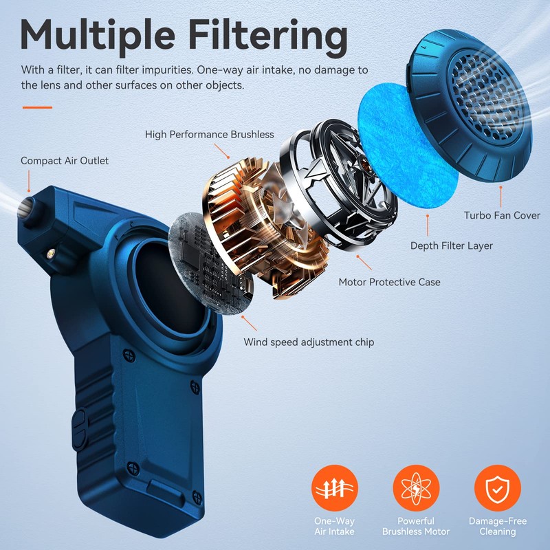 • Have you ever seen a blower with a filter? - When you insert a professional replaceable filter into the Reesibi electric dust blower, you can efficiently filter dust and finer impurities and blow out purer compressed air to protect your camera lens or other sensitive electronic devices. It can also prevent other impurities from entering the device and damaging it.