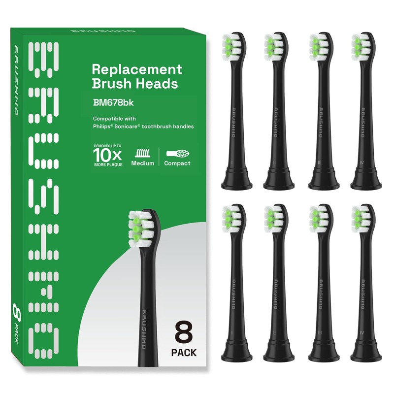 Brushmo Whitening Replacement Toothbrush Heads, Compatible with Philips Sonicare Click-on Electric Toothbrush Handles, 8 Compact Heads, Medium Firm Diamond-Shape Dupont Bristles, BM678bk, Black