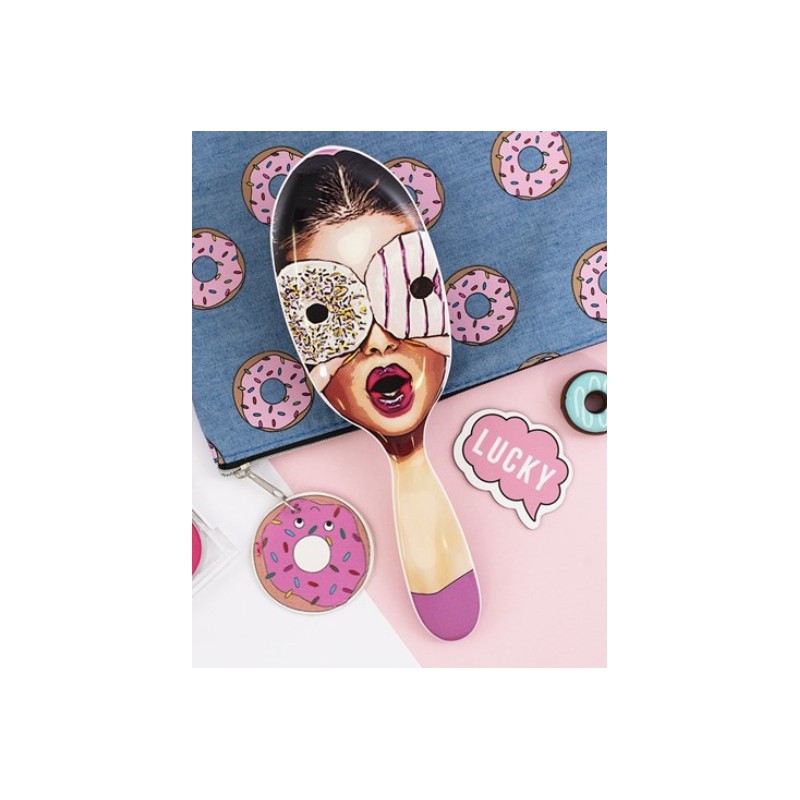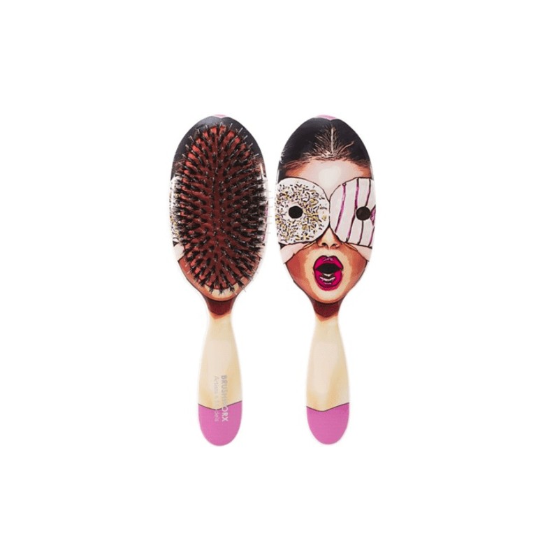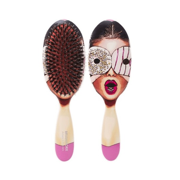 The Brushworx Artists and Models Hair Brush Collection elevates the simple cushion brush into a work of art with imaginative and unique designs. The Sugar Baby brush utilizes porcupine bristle (nylon and boar bristle) and a soft cushion base to create soft, silky hair with incredible shine and lustre. The boar bristle distributes hair's natural oils for a soft, luxurious finish, while the nylon bristle deeply penetrates any hair texture. The soft cushion base allows for gentle styling, making it perfect for detangling, blow-drying, finishing updos, distributing styling product, and brushing out heat styled curls.