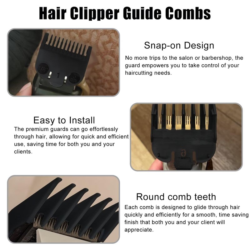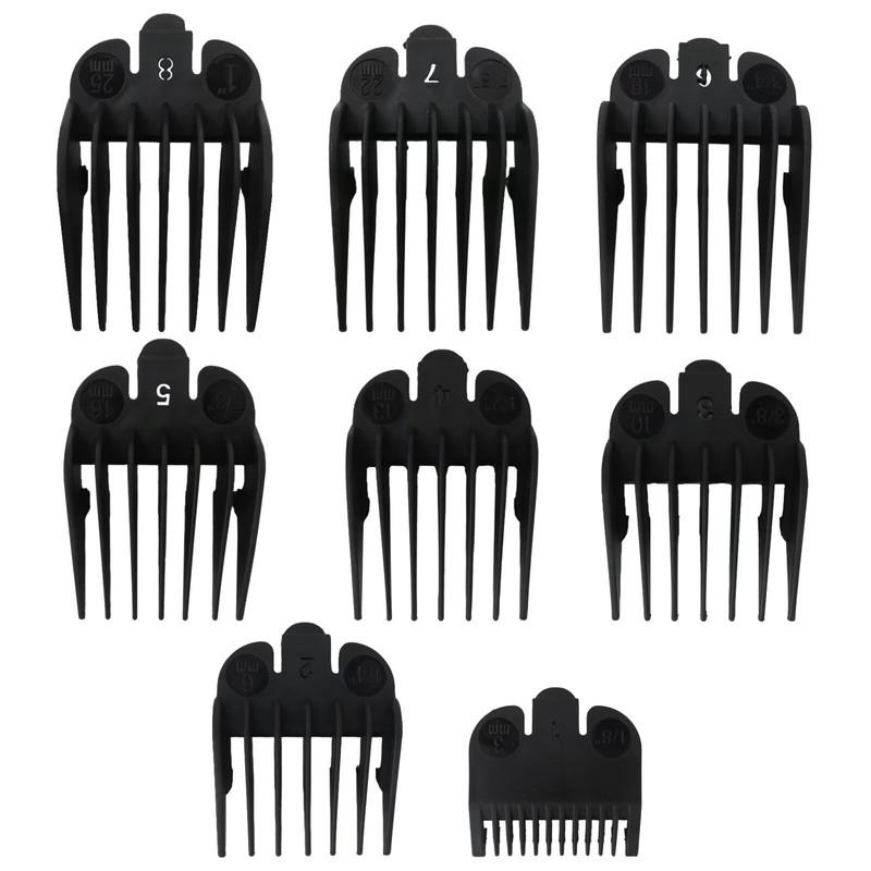 5. The universal clipper comb set includes 8 sizes: 1/8”, 1/4”, 3/8”, 1/2”, 5/8”, 3/4”, 7/8” and 1". Can meet your requirements for creating various hairstyles.