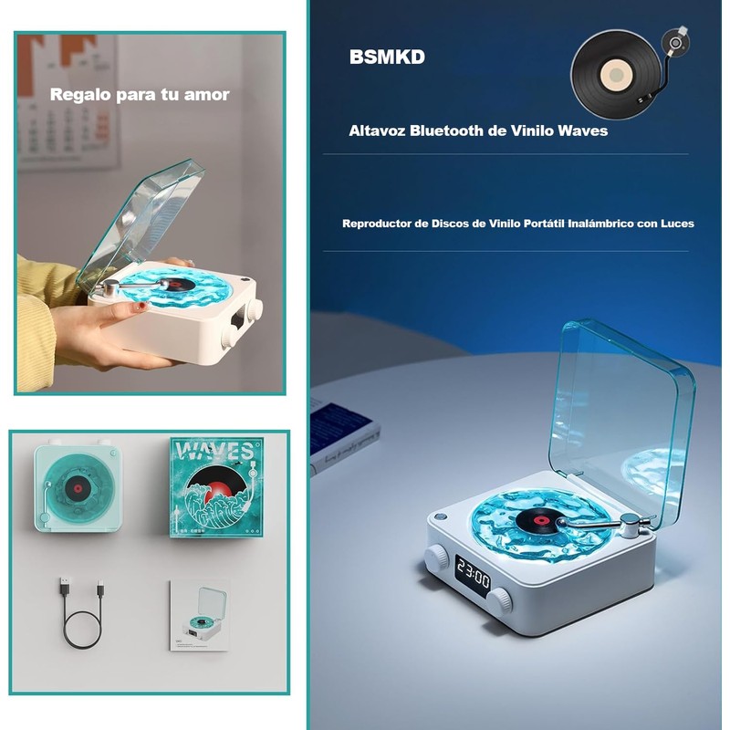 - 【Diseño multifuncional】 Este Tocadiscos de Vinilos Waves tiene una visualización clara de la hora y la energía, lo que le permite verificar la hora y cargar a tiempo. El altavoz inalámbrico combina altavoces estéreo de primera calidad con una luz nocturna y una pantalla de hora, todo en un diseño de tocadiscos elegante y clásico. Es la combinación perfecta de funcionalidad moderna y estética retro