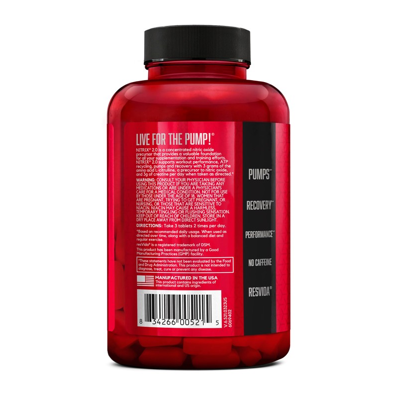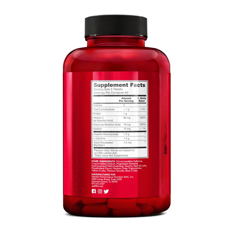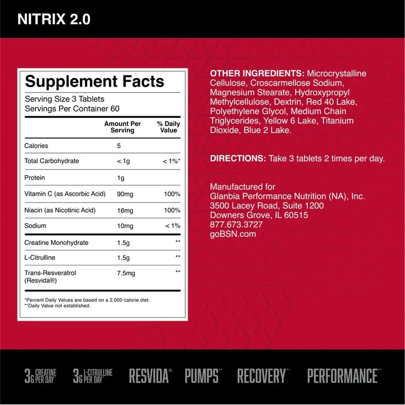 BSN NITRIX 2.0, Workout Supplement, Nitric Oxide Precursors, 3g Creatine, 3g L Citrulline, L-Citrulline, Supports Workout Performance, Pumps, Muscle Recovery and Endurance, 90 Tablets, 30 Servings