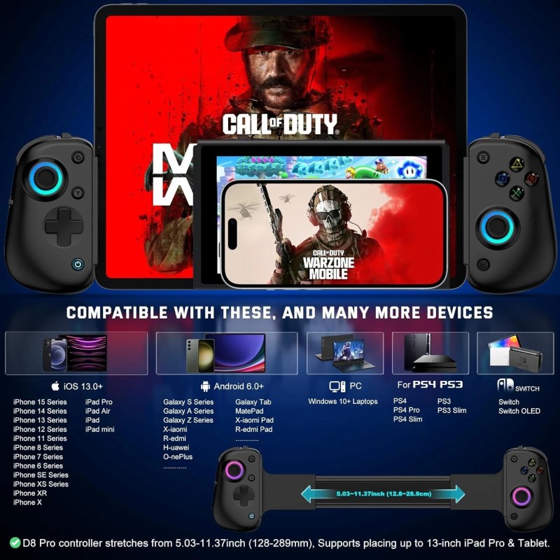 - Multi-Platform Controller with RGB Rocker: Rocker RGB has 'lights breathing', 'lights fixed' effect, and 'lights off'; Supports direct play on iPad/iPhone/Android/Tablet/PC/NS Switch/PS4; This phone controller is compatible with iPad/iPad Pro/iPad Air/iPad mini, iPhone 15 Series/iPhone 14 Series and more iOS devices; Compatible with Galaxy Tab S9/S9+/Galaxy Tab S8/S8+, Galaxy S23/S22 and more Android devices (not supported fire tablet); Fits up to 13-inch iPad Pro and Tablets