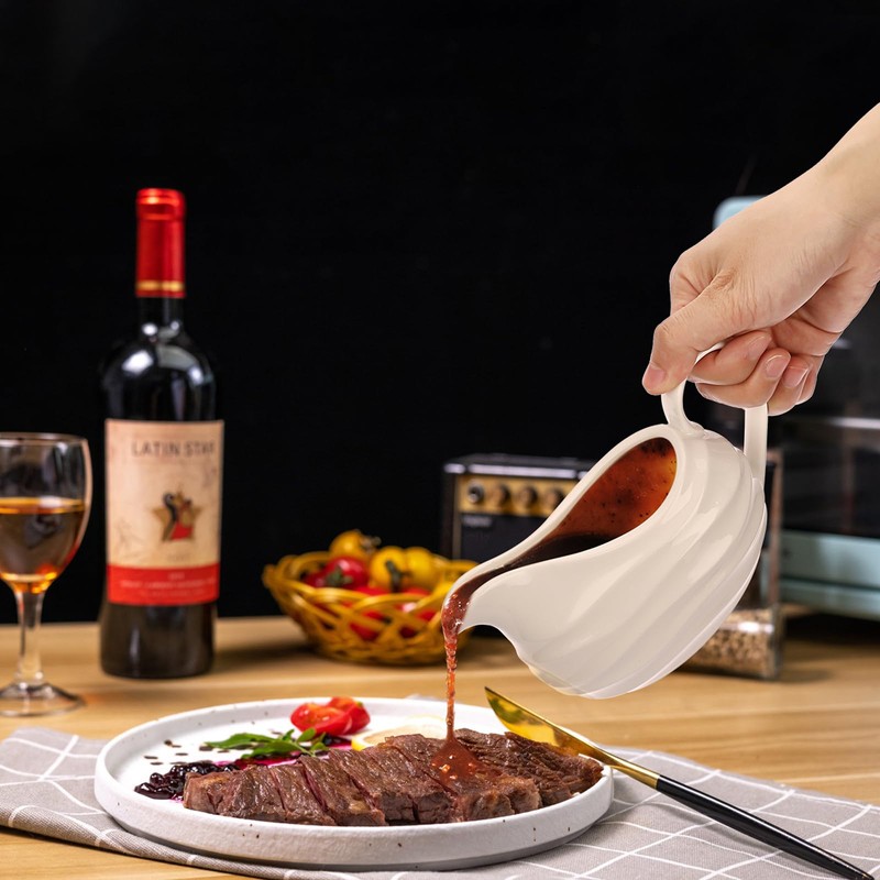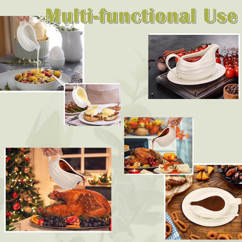 • ELEGANT GRAVY BOAT WITH TRAY & SPOON - Size: 6.9 x 5.2 inch, capacity: 13 ounces. Each gravy boat is separate from the tray. When you raise the gravy cups, no more sauce drips from the tray onto the table! Not only suitable for Christmas and Thanksgiving, but also for daily use!