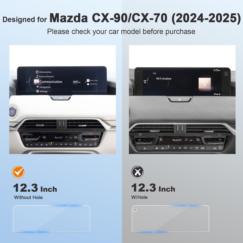 - Precision Fit, Factory Quality: 2025 Mazda CX-90 screen protector 12.3 inch fits with laser-cut precision, tailor-made for the 2024 2025 Mazda CX-90 (2024 CX‑90 PHEV) / 2025 Mazda CX-70 (2025 CX‑70 PHEV) 12.3" full-color center display (Only suitable for screen without hole, not for with hole!!!). Enjoy precision fitment that aligns perfectly with your Mazda display, delivering a factory finish