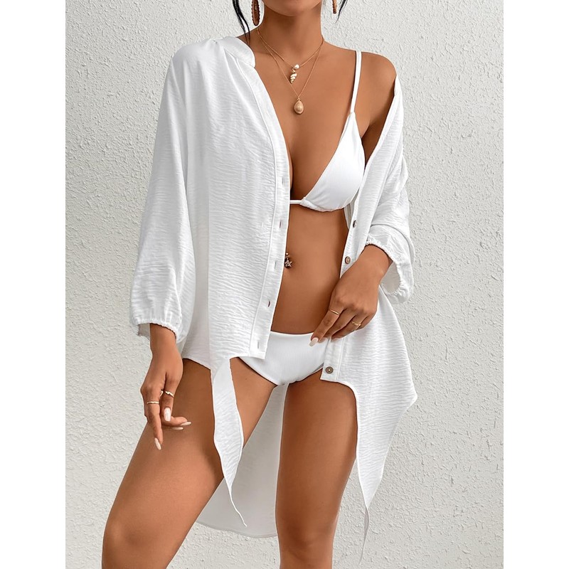 This exquisite swimwear accessory is perfect for fashion ladies who want to make a statement at the beach or pool. Crafted with long sleeves and a flattering V-neck, this cover-up is designed to enhance your natural beauty. Featuring a trendy button-up style with charming tie-front detail, this cover-up adds a touch of elegance to your swimwear ensemble. The irregular hemline creates a unique and eye-catching look, ensuring you stand out. Whether lounging by the pool or strolling along the shoreline, this cover-up will make you feel comfortable. Made from high-quality materials, this cover-up offers superior comfort and durability. The lightweight fabric is perfect for those hot summer days, allowing your skin to breathe while providing ample coverage. Its versatile white color complements any swimsuit, making it a versatile addition to your beachwear collection. Designed specifically for women, this cover-up embraces your curves and accentuates your figure in all the right places. It's the perfect choice for those who want to feel confident and stylish while enjoying their time by the water. Upgrade your beach wardrobe with our fabulous Beach Cover Up for Women. Whether heading to the beach or pool, this cover-up will elevate your swimwear game to new heights.