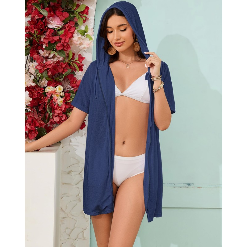Bsubseach Terry Cloth Cover Up - Women 2025 Zipper Swimsuit Coverup Hooded Swim Robes Beach Coverups with Pockets Navy Blue XL