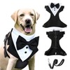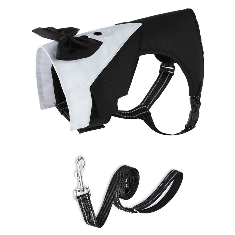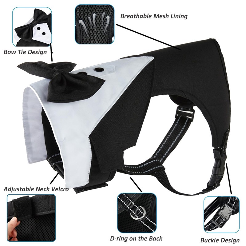 - Dog Tuxedo Harness:Unique design Formal suit style with black bow tie. The simple style fits almost any dog breed and integrates into different environments. Your dog would be attractive and cute when wearing.
