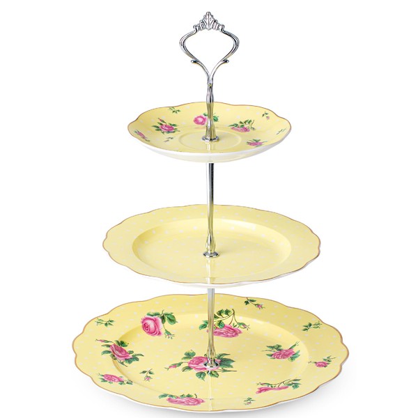 - BTaT 3-tier cupcake stand features a delicate floral pattern set against a soft yellow background, adorned with pink roses and green leaves, which enhances the presentation of your desserts and appetizers.