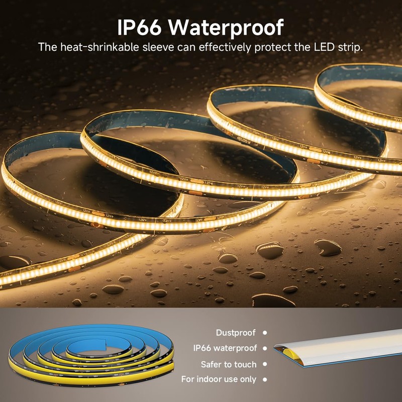 - IP66 Waterproof: Unlike conventional IP65 strips, our IP66 strip is equipped with a heat shrink tube on the outer layer, which protects the COB strip from splashing water and heat. Ideal for installation in the bathroom or other areas with light moisture.
