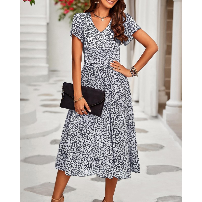 - Casual Summer Dresses - This Is a Real Stunning Dress For Festive Events And Romantic Dates! The Cute Floral Dresses Featured With Typical Attributes Such As V Neck, Ruffle Tiered Short Sleeve, Smocking At Bodice, Vibrant Floral Element, Midi Length Complete The Design Of This Relaxed Fit Summer Dresses