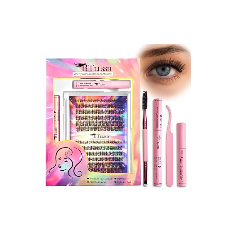 BTLLSSH Lash Extension Kit Individual Lashes Cluster D Curl Eyelash Clusters Kit with Lash Bond Seal Lash Applicator Tool for Self Application