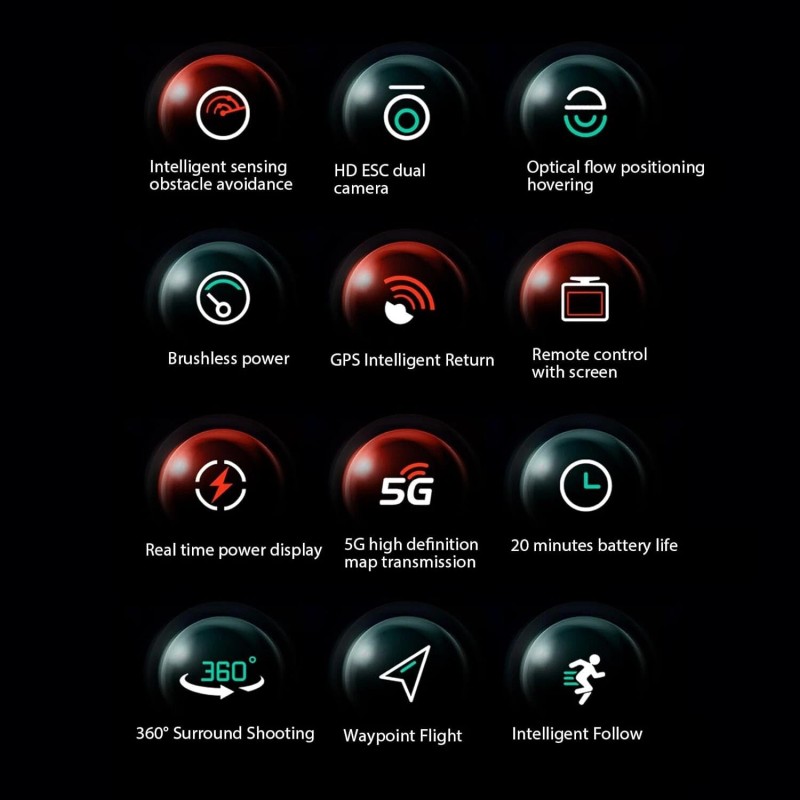 Intelligent Obstacle Avoidance, Dual Camera with Electronic Adjustable, Optical Flowing Hovering, GPS Positioning, Screen Display, Low Power/Out of Control/Out of Range Return, One key Return, Brushless Power, Gesture Photo/Video, Beauty Filter, One key Take off/Landing, Multi speed Mode, HD Transmission, Surround Shooting, Waypoint Flying, Phone Control, Body Battery Display