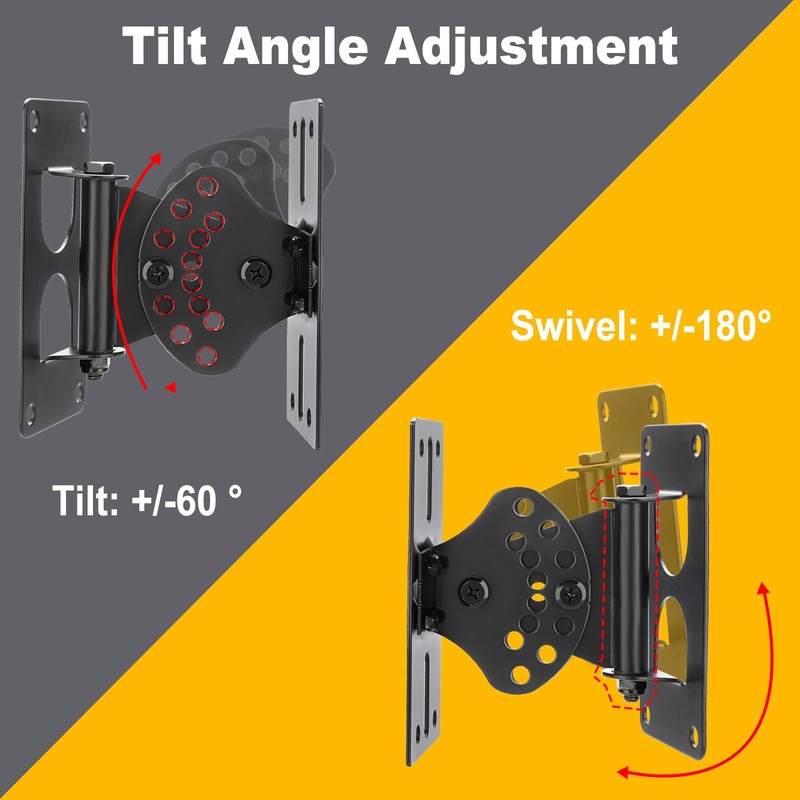 - Angle Adjustment: Achieve the perfect listening angle for an immersive sound experience. Our wall mount speaker brackets offer extensive adjustability with 60º of tilt and 180º of swivel. This allows you to precisely direct your speakers towards your listening area, optimizing sound projection for crystal-clear, studio-quality audio in any room, whether for movies, music, or gaming.