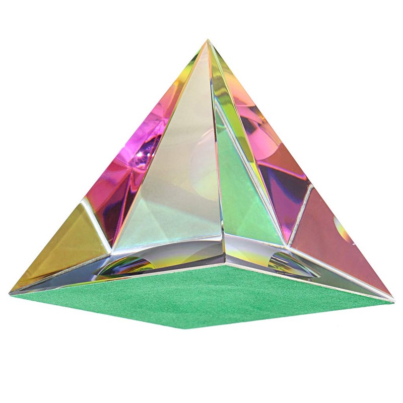 • High quality iridescent crystal pyramid with full color coating; sparkles in the sun.