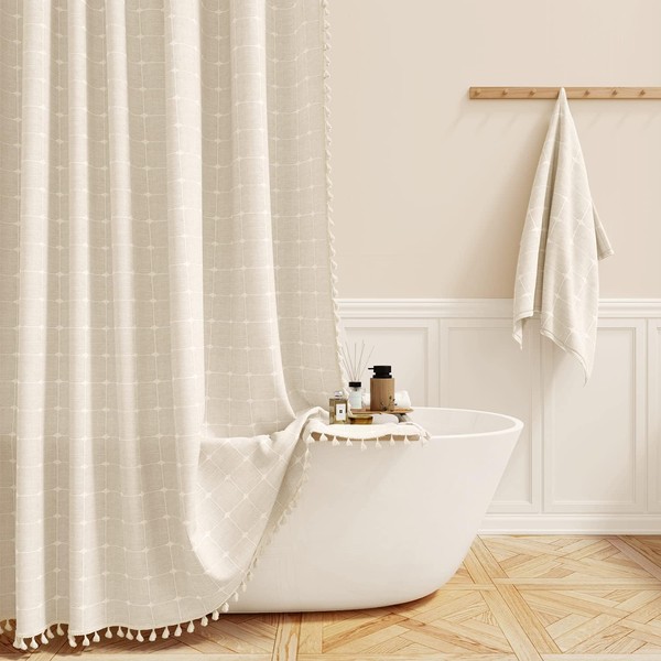 BTTN 182 x 200cm Drop Long Shower Curtain, Boho Farmhouse Checkered Rustic Fabric Bath Curtains with Tassel, Bohemian Vintage Waterproof Weighted Cloth Shower Curtain Set with 12 Hooks, Beige/Cream