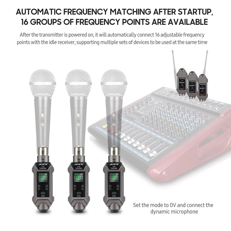 Automatic frequency matching after startup, 16 groups of frequency points are available: after turning on the transmitter, it automatically connects 16 adjustable frequency points to the inactive receiver, which supports multiple sets of devices at the same time.