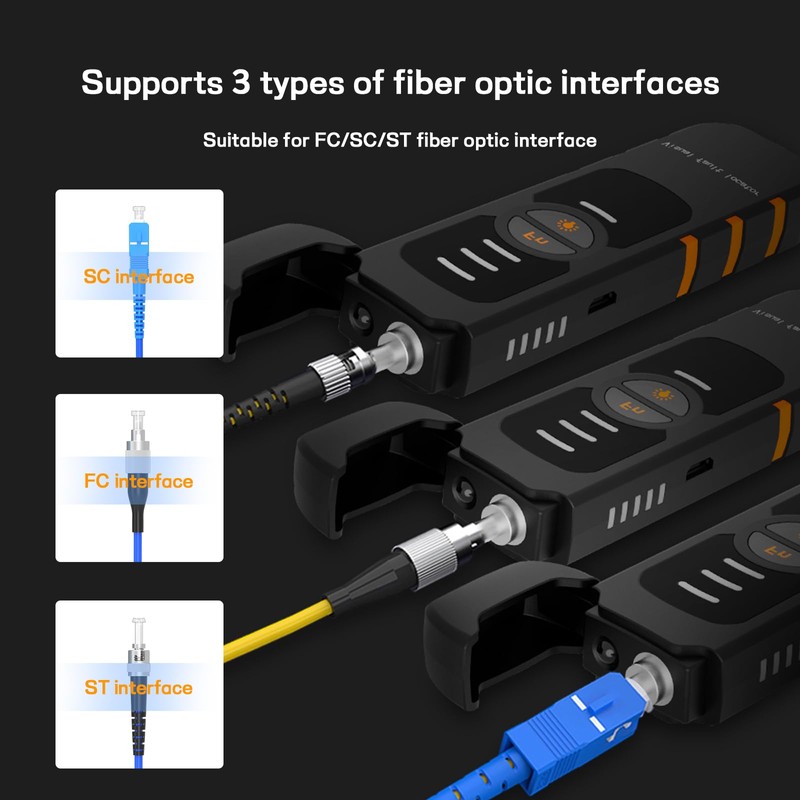 - "Excellent Function",The detector's 2.5mm universal connector is designed for compatibility with ST, SC, and FC, and can interfere with different circular and square optical cables. It can test both single-mode and multi-mode cables.LC interface requires additional adapter.