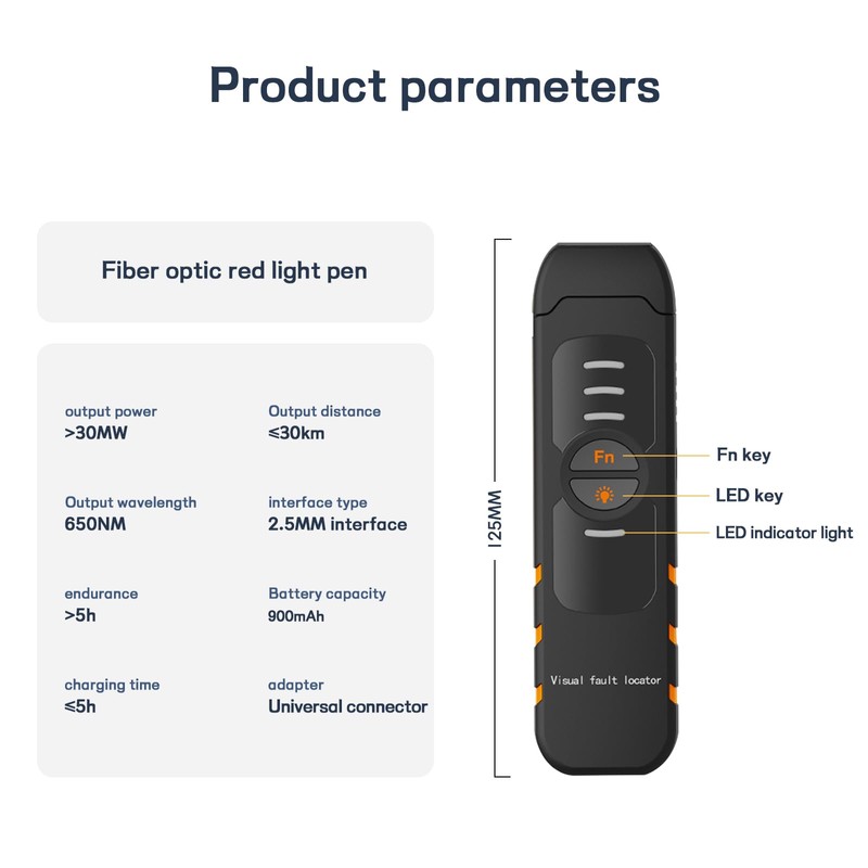 - "Detection Distance",This visual fault locator has a strong red light output that can travel 40-50 kilometers. The efficient power supply circuit provides stable power.strong Penetrating power, stable property. And have two mode: always light and flicker.