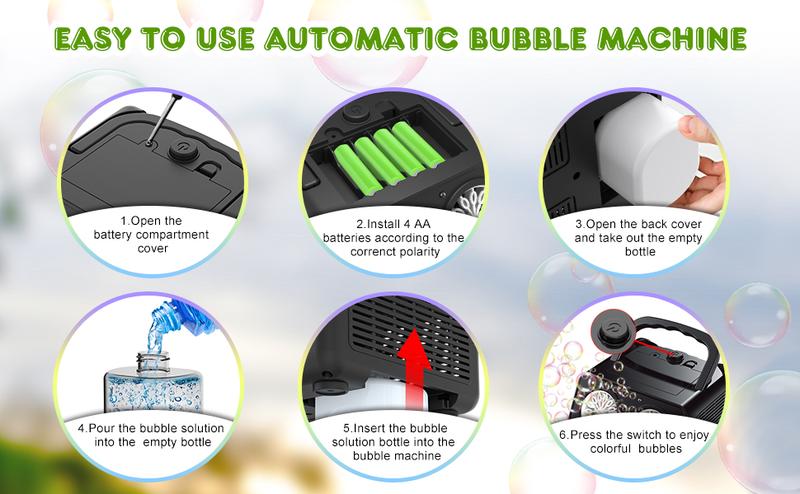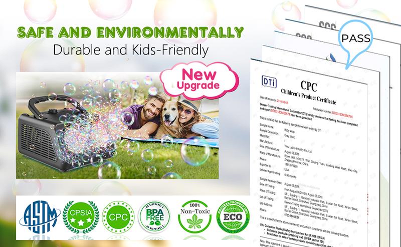- 【Premium Material And Safe Design】This electric bubble machine is made of high-quality friendly ABS material with superior toughness and rust protection, durable to use for several years, The electric bubble maker has been passed CPC toys authentication to ensure safety for your kids, pets.