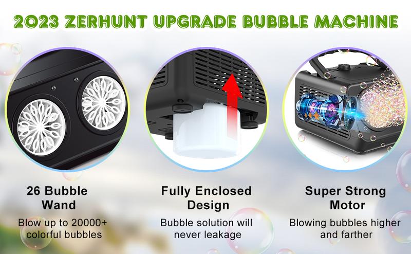 - 【Upgrade Output 20000+ Super Bubbles】The newly upgraded Zerhunt bubble machine can generate 20000+ bubbles per minute, with 26 bubble wands. Zerhunt bubble machine blaster creates super strong bubble experiences with two different speed. It can blow tons of colorful bubbles faster, higher, and further, even indoors with no wind.