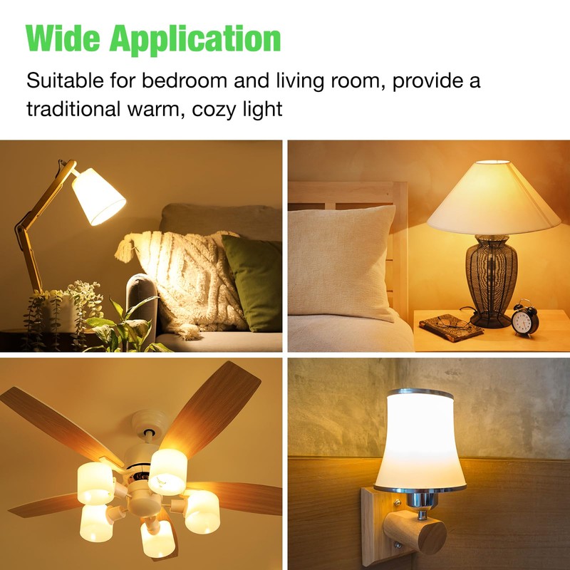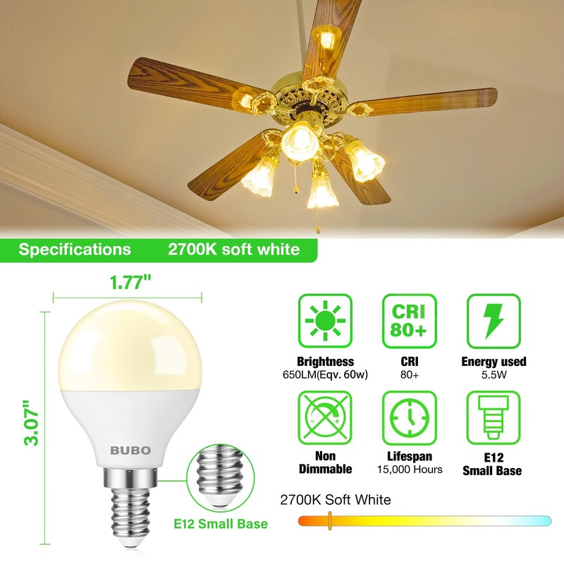- Easy to Install: This fan light bulb features a E12 small screw base, making it compact yet impressively bright. Ideal for various household lighting fixtures such as ceiling fans, candelabras, chandeliers, wall sconces, floor lamps, and table lamps
