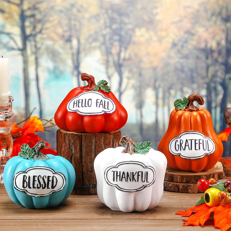 All Harvest Pumpkin Decor: you will receive 4 pumpkin sculptures, suitable for autumn table decoration; Each pumpkin decoration has a different color and comes with a logo, such as "HELLO FALL, THANKFUL, GRATEFUL, BLESSED", etc. It is very suitable for decoration on the dining table at home