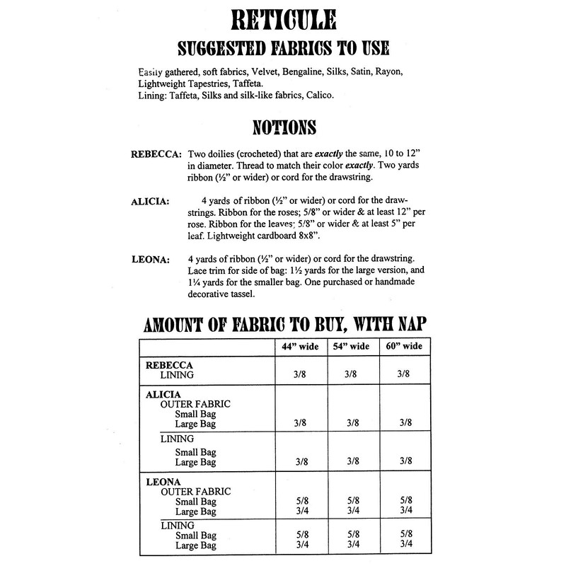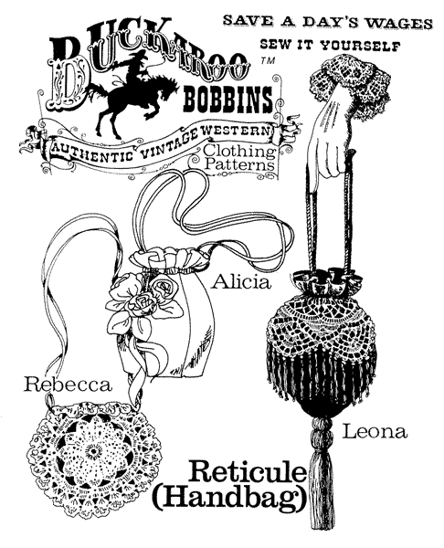 Buckaroo Bobbins sewing pattern for vintage style handbags. The pattern is uncut and complete with instructions. Reticules, also called "indispensables", were bags gathered at the top with drawstring handles used to carry a few indispensable items such as money, smelling salts, pistol, etc. since fashions of the late 1880's had no pockets. Dressy versions for special occasions were made with fabrics and trimmings to match their dresses. Reticules were also commonly used to carry needlework which one would take along on social calls. I've included an image above with a list of fabrics and notions for each bag. | |