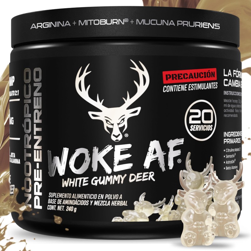 Bucked Up Woke AF Pre Entreno Pre Workout | Estimulantes + Beta Alanina + Citrulina + Cafeina Anhidra Microencapsulada| Entrenamiento, Energía, Desempeño y Vascularidad| Delicioso Sabor: White Gummy