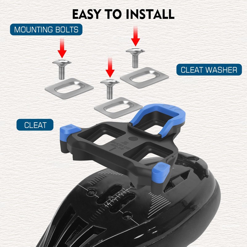 - 3 FLOAT OPTIONS:Bucklos spd sl road cleat has 3 colors corresponding to 3 floating angles of the cleat, red (0 float), yellow(6 float), and blue (2 float). Whether you are a professional or amateur rider, indoor or outdoor cycling, you can find cleats that are suitable for your ride