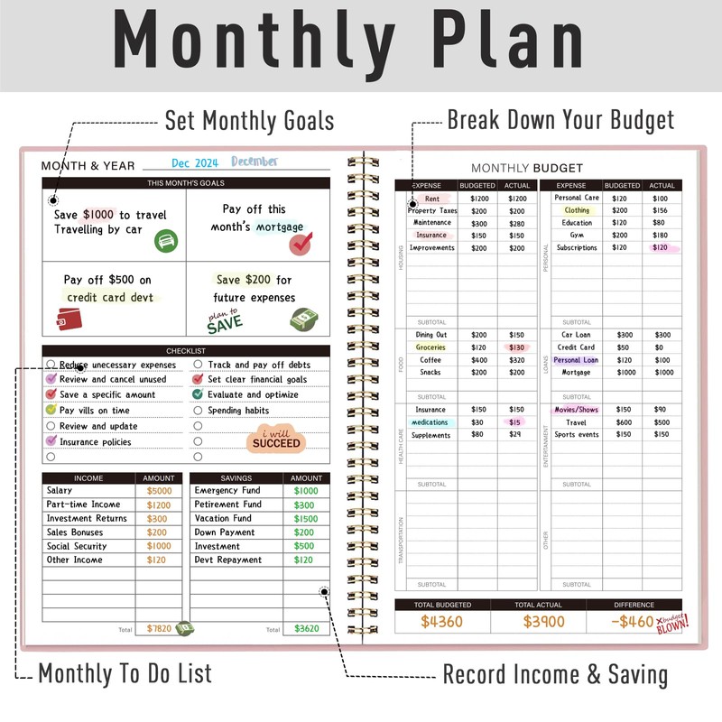 - Intuitive Monthly Organization - Enjoy smooth navigation through dedicated monthly sections, empowering you to set goals, track income, manage expenses, and monitor progress towards financial success with ease over 12 months.