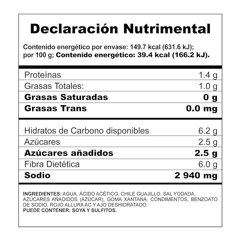 | Ingredientes | agua, ácido acético, chile guajillo, sal yodada, azúcar, goma xantana, condimentos, benzoato de sodio |