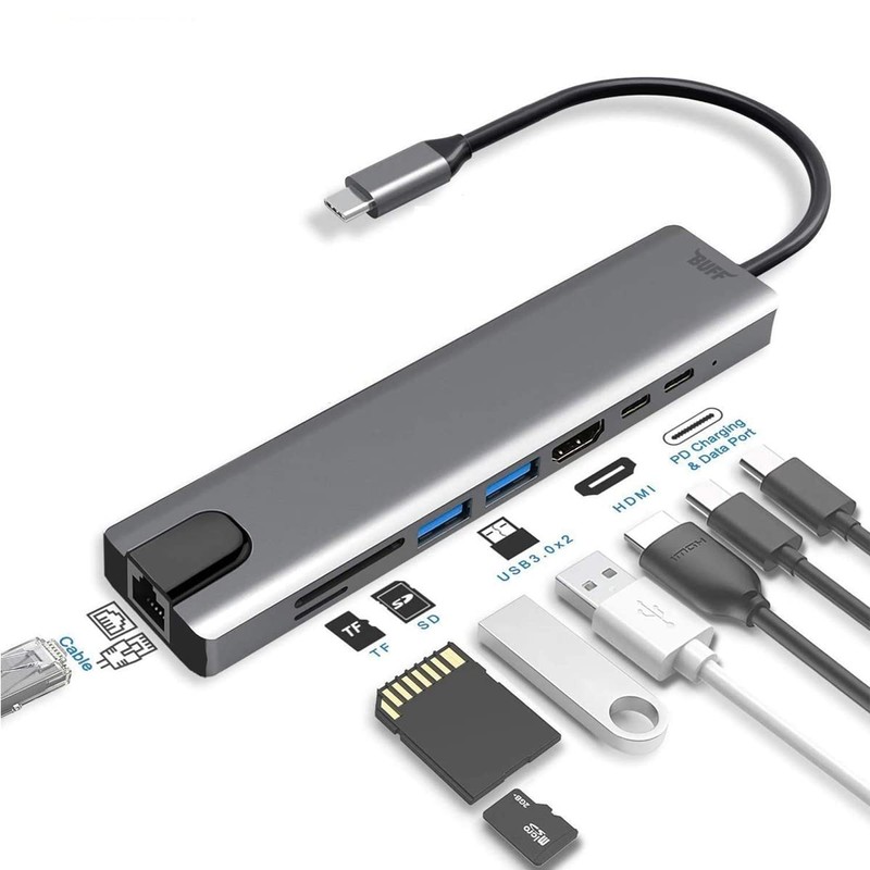 Buff Labs Type C USB 8 in 1 Hub Çoklayıcı Adaptör USB 3.0, HDMI, USB C, SD, Ethernet