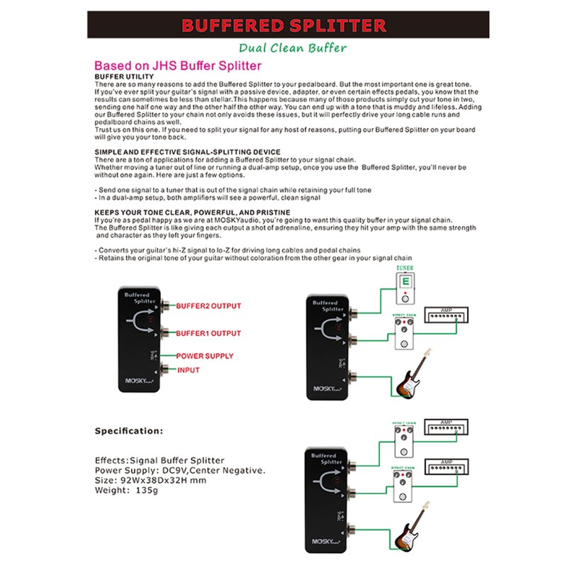 - The Buffered Splitter is like giving each output a shot of adrenaline, ensuring they hit your amp with the same strength and character as they left your fingers.