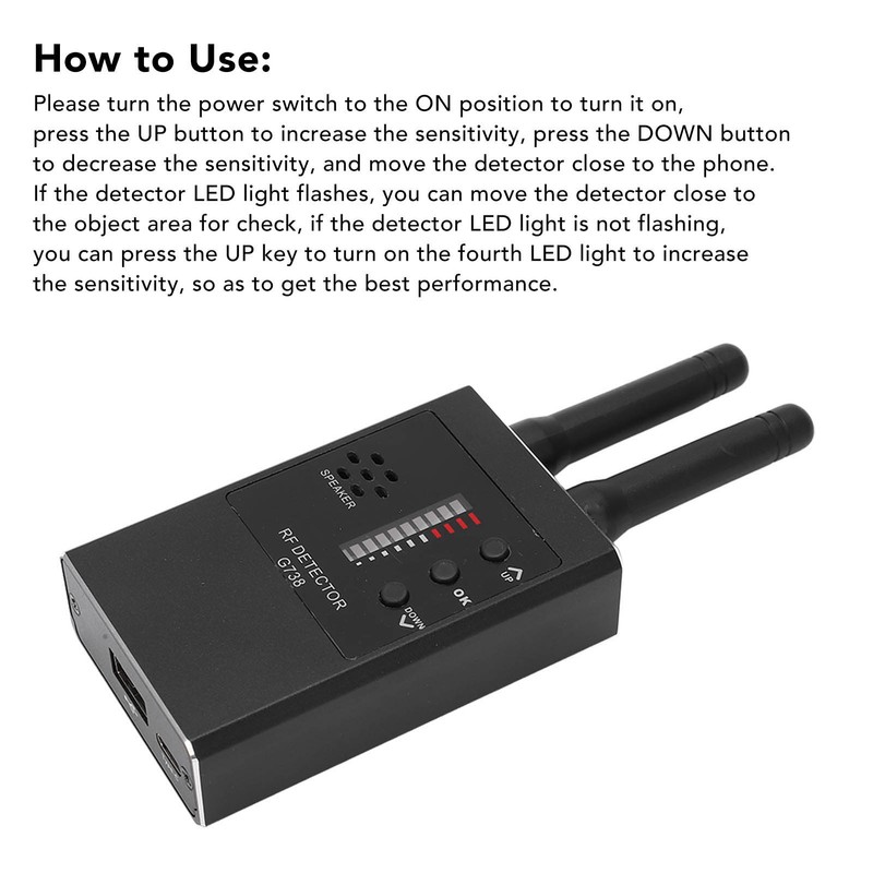 1、Smart Testing: Able to filter the clutter signal and find a stable signal source for analysis, the detector can also adjust the sensitivity to determine the direction and distance of the signal source. 2、Bugs Detector: Works effectively in finding 2G, 3G, 4G and wireless devices, 1.2G /2.4G & 5.8G wireless cameras, and can accurately locate GPS. Can also be applied to room, bedroom, conference room and so on. 3、Accurate Work: Designed to have 300-2700MHz wide testing rage, the signal finder is a digitally controlled high sensitivity wireless detection device. 4、With 2 Alarms: Also has with sound and vibration alarms as well as LED indicator, making the alarming much more clear. 5、Easy Carrying: This lightweight and compact bug scanner is very convenient to store and carry for both indoor and outdoor inspection.