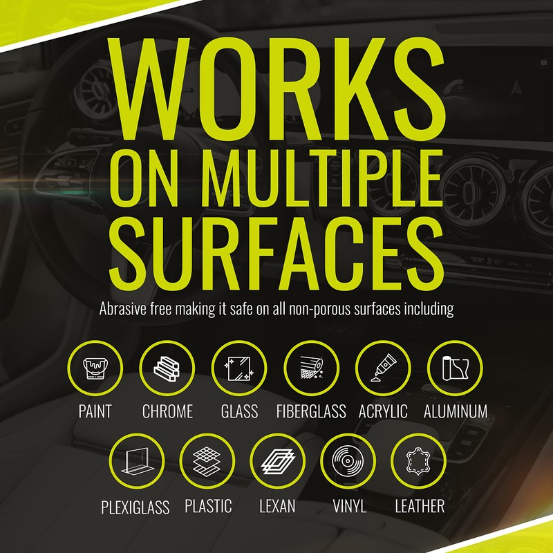 - Works on Multiple Surfaces – This car cleaner and polish offers hundreds of uses and is abrasive free making it safe and effective on all non-porous surfaces including paint, chrome, glass, fiberglass, acrylic, aluminum, plexiglass, plastic, Lexan, vinyl, and leather.