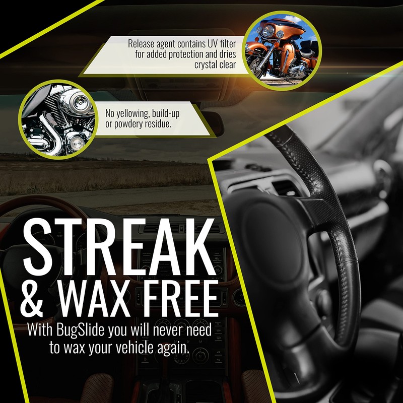 - Streak and Wax-Free – With BugSlide you will never need to wax your car again. Applied and paired best with a microfiber cloth towel to wipe clean, the release agent contains a UV filter for added protection and dries crystal clear with no yellow tint, film, build-up or powdery residue.