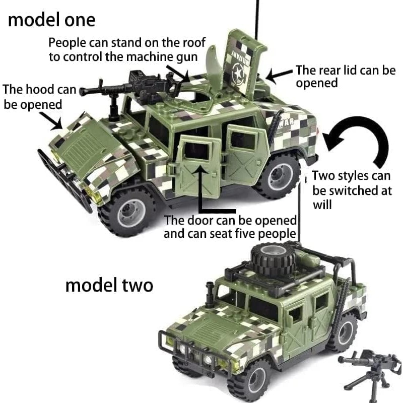 - 【Unique Design】The roof and trunk of the military vehicle can be changed into two shapes, and the door can be opened. The vehicle includes 2 different styles of stickers, 1 color detailed assembly manual. 6 army figures are sent randomly, and we will try to send you 6 different stylings.