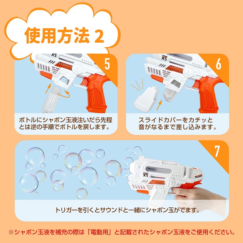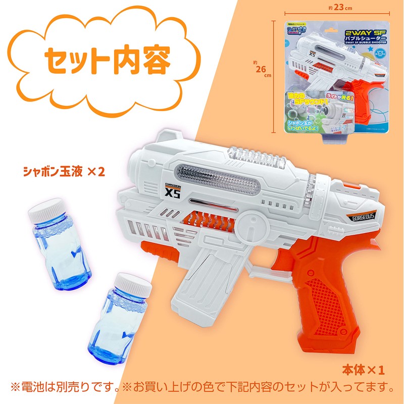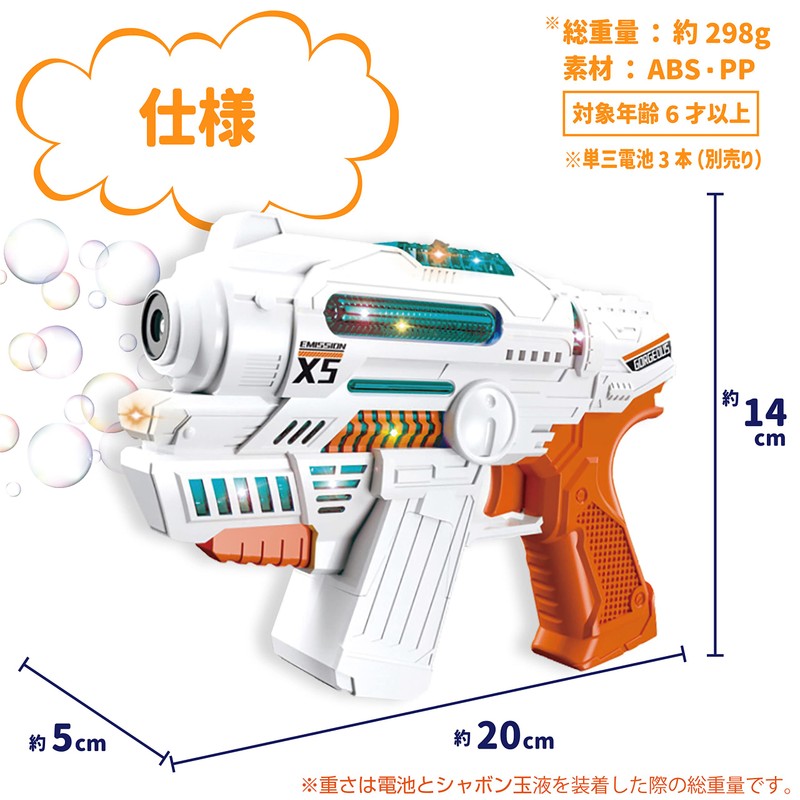 - [Package Contents] Bubble gun body / 2 bubble liquid / Installation instruction manual (reverse of package) *3 AA batteries (sold separately)
