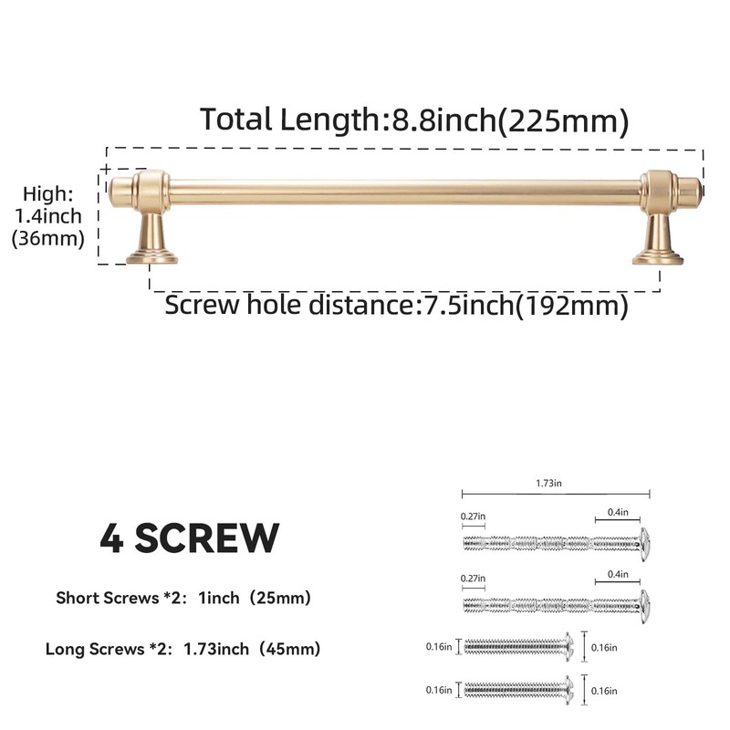 • 【Package includes】7-1/2 inch Cabinet Handle X 10 , each handle comes with 4 screws respectively 1 inch (25mm) screws x 2, split screws (45mm) x 2 (custom length available). You can choose the right screws according to the thickness of the cabinet. Each drawer handle is individually packaged to ensure excellent quality and prevent color fading